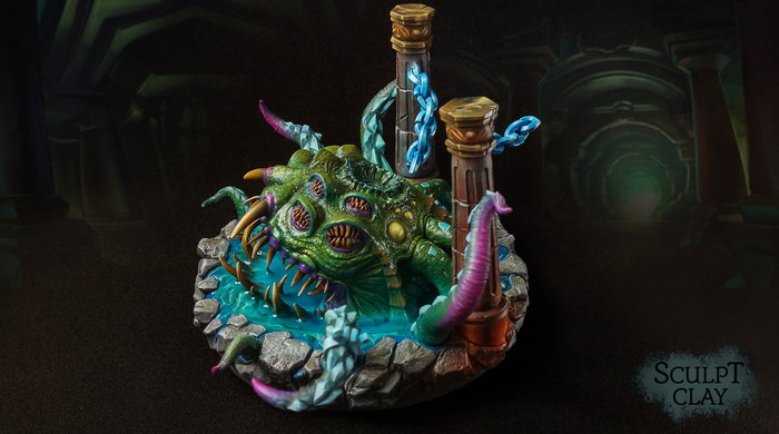 - Эффект слизи: На щупальцах и пасти добавил глянцевый лак с каплями, залил УФ смолу вокруг — будто божество источает кошмар даже в миниатюре.