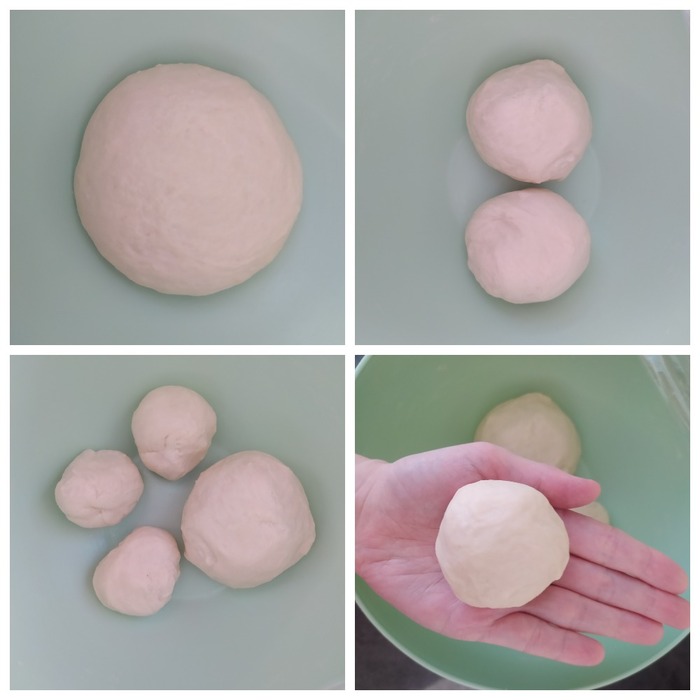 Разделить тесто на порции: сначала поделить пополам, а потом каждую часть разделить еще на 3 равных шарика.