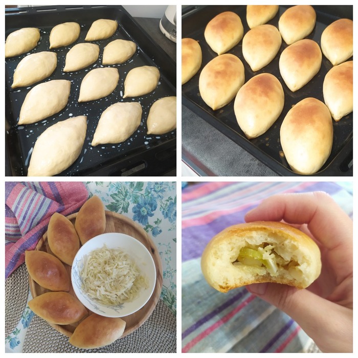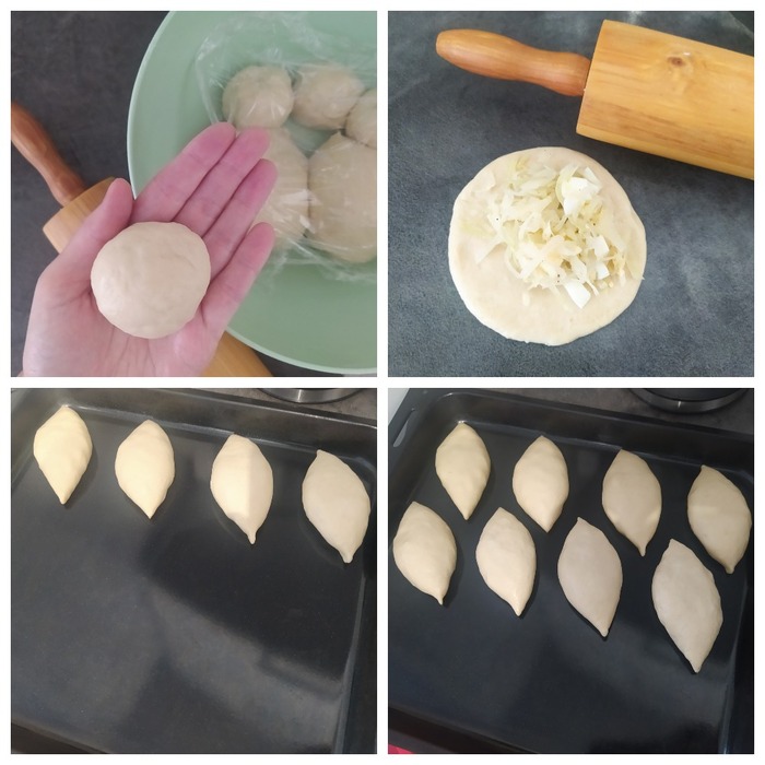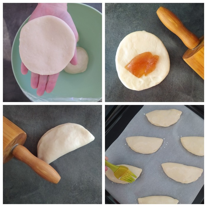 Каждый шарик раскатать в лепешку толщиной около 5 мм. Положить начинку на одну сторону и укрыть второй стороной. Я не защипываю, только слегка приживаю края.