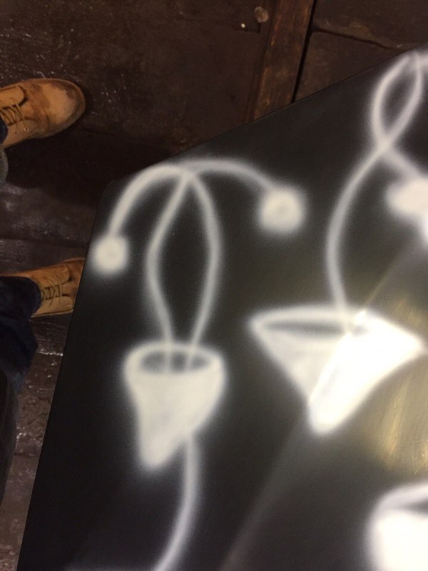 Придерживаясь его, но отбросив корни, шкуркой убрали лак и нарисовали основу.(Т.к. цвет на чёрном будет тусклым, решили сделать белый фон)