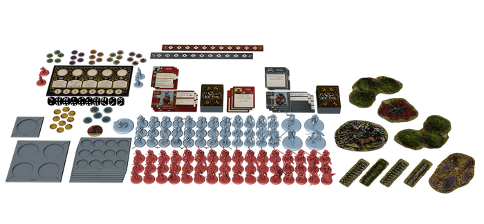 Фишками игры кроме движения подставками можно назвать наличие планшета дворцовых интриг и небоевых персонажей взаимодействующих с ним. С их помощью можно раздобыть плюшки или дополнительные действия для своей армии а также дебафы для армии противника. Командиры армий имеют колоды с разными хитростями позвляющие проводит разные манёвры и внезапные атаки, так же каждая подставка может быть снабжена героем или командиром которые добавляют юниту новые свойства. Миниатюры выполнены из пластика, они по сути являются счётчиком жизней для каждой подставки, их много, они маленькие и не очень хорошо детализированы. На мой взгляд это один из главных недостатков игры. Также после завершения локализации некоторых коробок этот процесс остановился, все новые коробки только на английском и не продаются в желто-чёрном магазине. После февральских событий стоимость коробок стала заоблачной но игра по прежнему на слуху и имеет много своих фанатов.