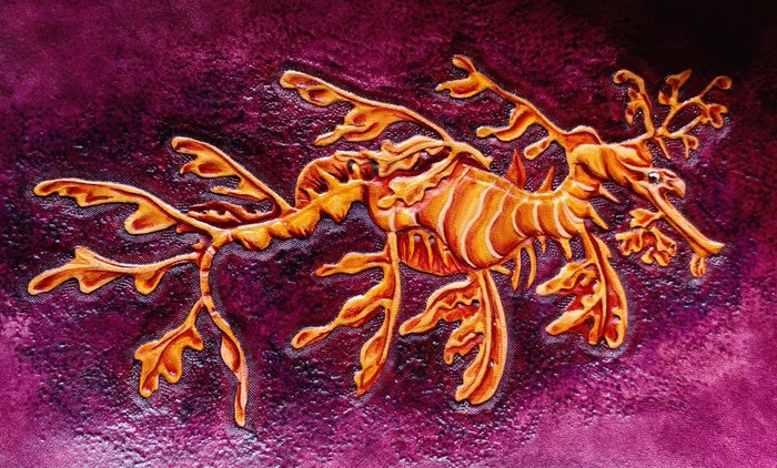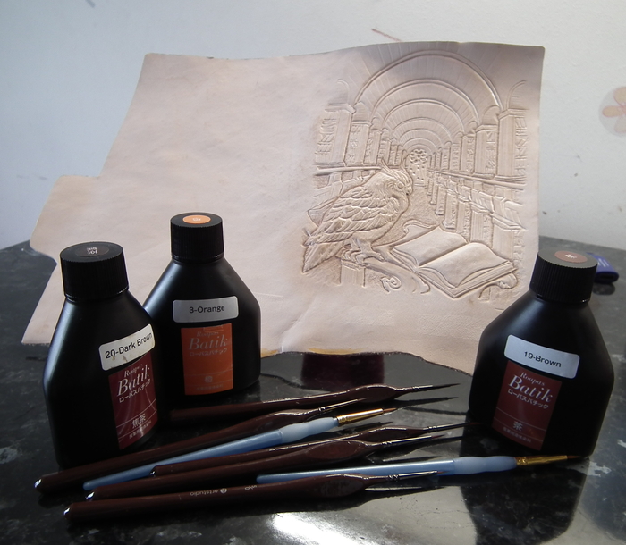 Дальше покраска. Этап не менее важный чем тиснение и еще более опасный в плане возможности все испортить. Краски у меня в этот раз Seiwa. Это японские спиртовые проникающие краски. Они с кожи не сотрутся никогда J. И в отличии от акрила они подчеркивают текстуру кожи. Своего рода кожевенная акварель.