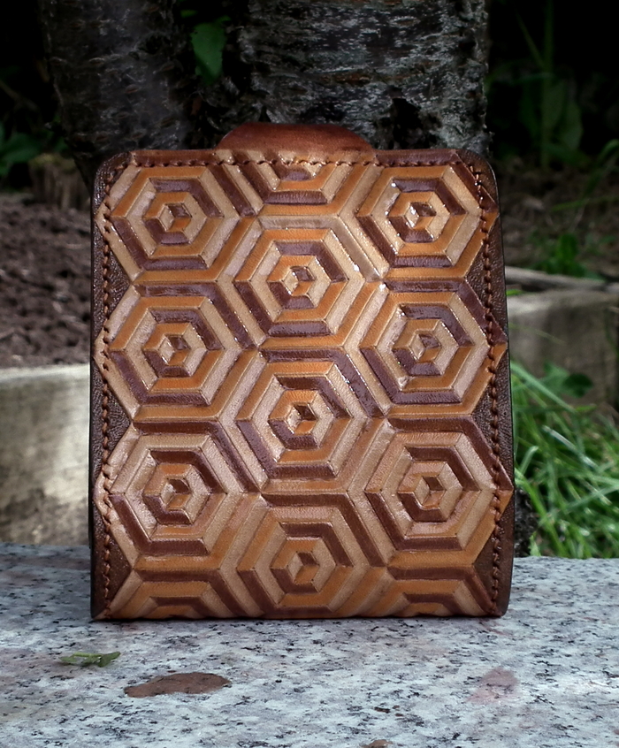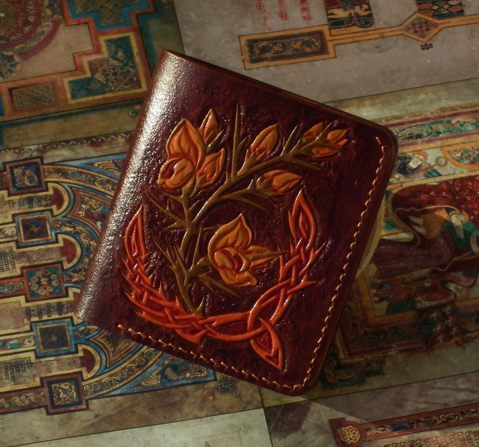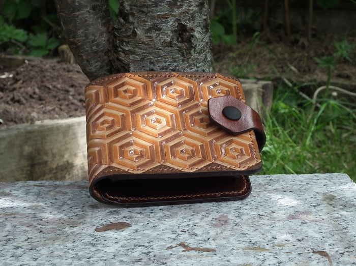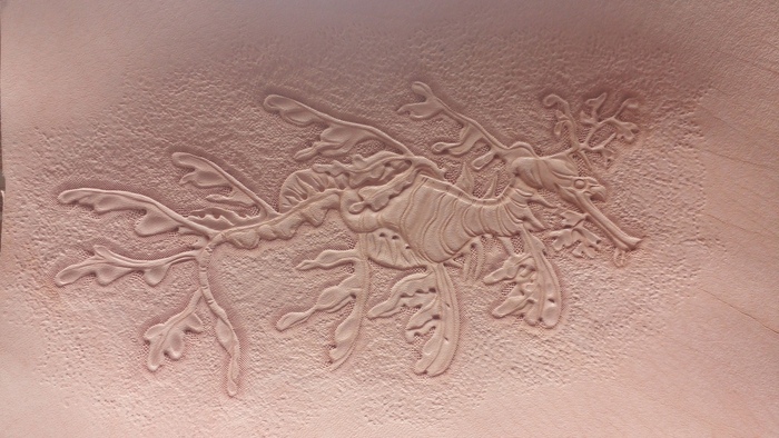 Обычно кожа прибывает от поставщика немножко суховатая, тиснить такую кожу трудно и результат не впечатляет. Поэтому сначала ее нужно пропитать маслом животного происхождения (не сливочным J). Через пару часов после этого кожу надо намочить. Так чтобы обе поверхности потемнели. И примерно сутки после она сохнет до состояния чуть-чуть темнее исходного цвета.
