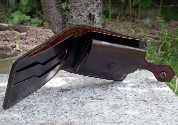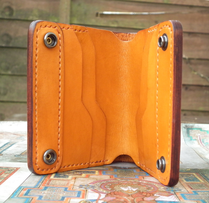 Дальше сборка внутрянки. Это такая же кожа как под тиснение, поэтому перед использованием надо ее покрасить с обеих сторон и финишировать. Лак тоже Seiwa. Краска – не определенная) Попытка красить спиртовой = долгий геморрой по достижению равномерного покрытия. Пока лучший результат получился с Eco Flo All in One.