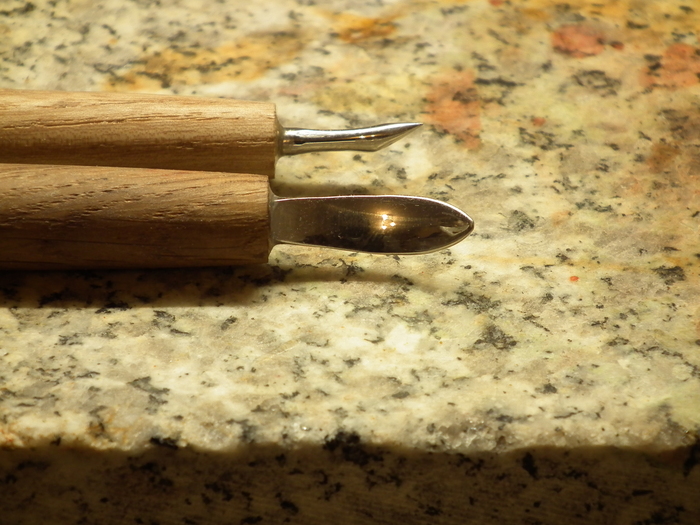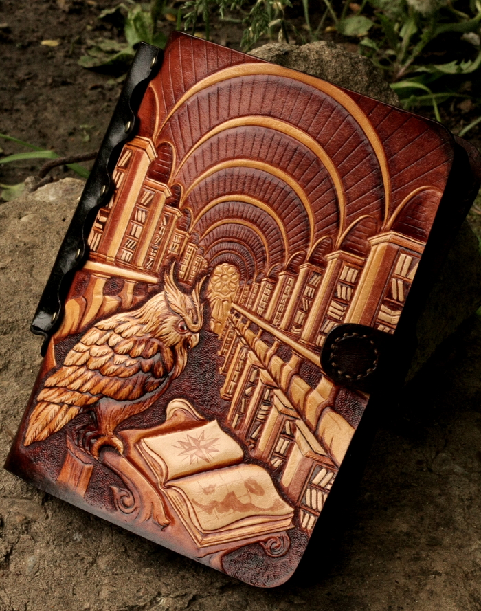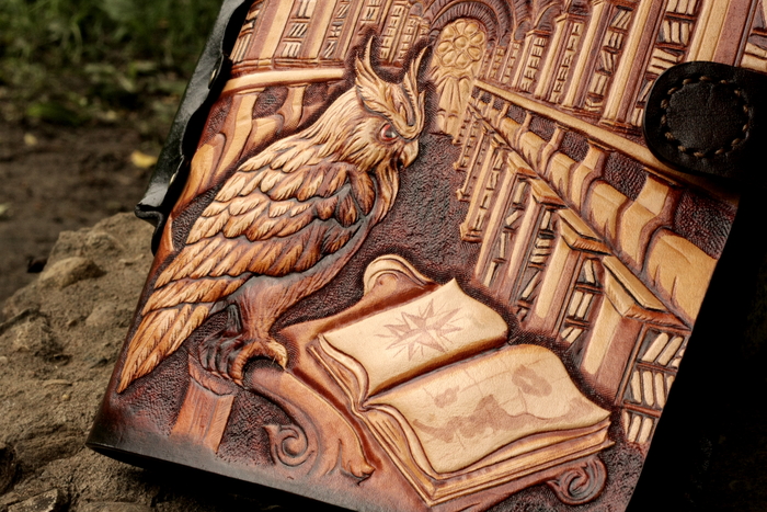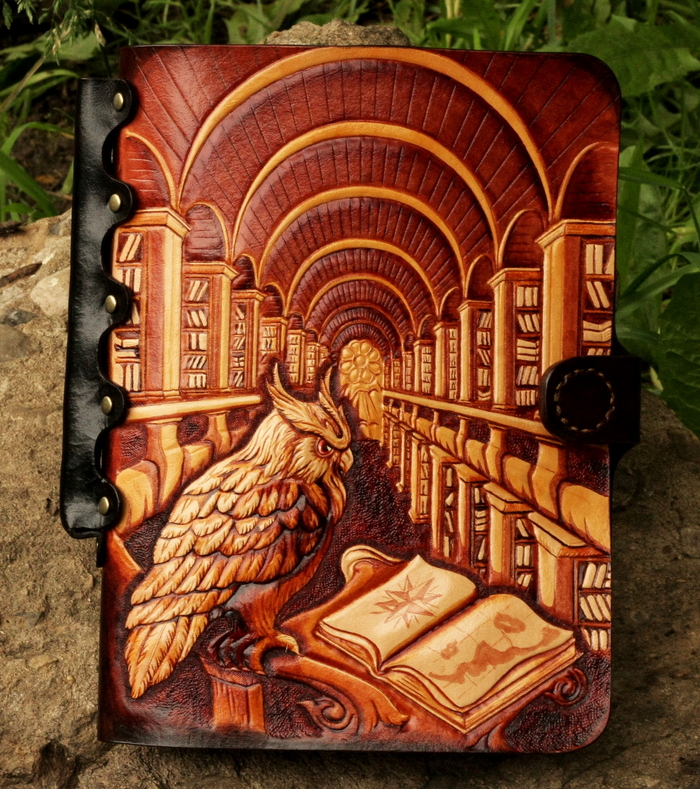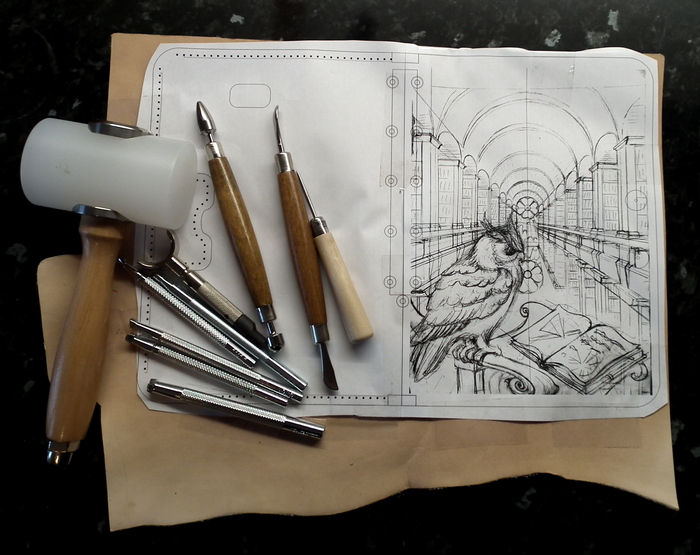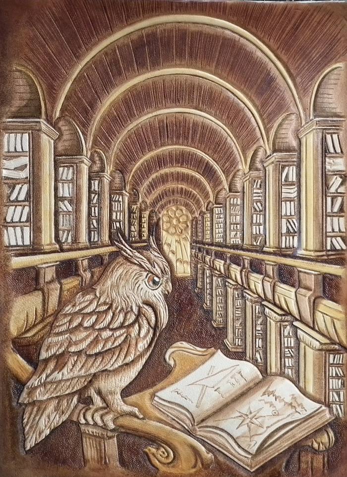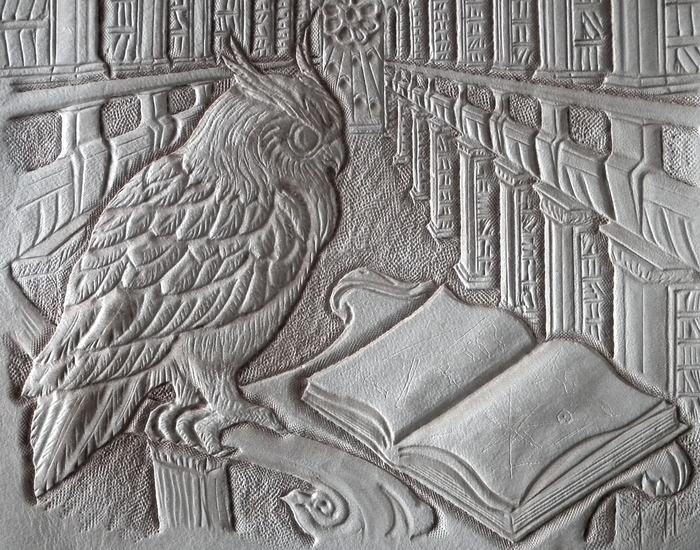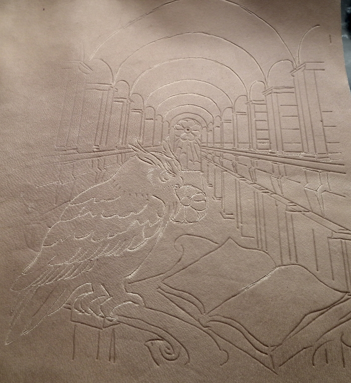 По обведенной картинке все контуры обозначающие большой перепад глубины (контур совы, контуры стеллажей) прорезаются поворотным ножом и утапливаются штампом с точечками. Перепады глубин внутри предмета утапливаются плоским полированным штампом. Детали рисуются кардиной (инструмент похожий на стеки для скульпторов).