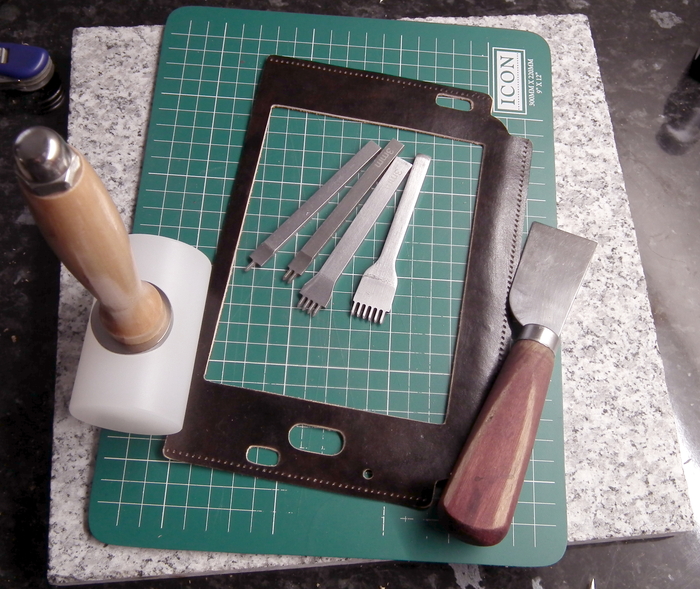 Я печатаю выкройки на бумаге, приклеиваю их на кожу и сначала пробиваю отверстия под швы. Если делать это на готовой заготовке, ее перекосит и швы будут неровные. Важно следить за тем, чтобы острие пробойника попадало ровно в середину шовного пунктира. Иначе опять же швы будут неровные. Пробойники у меня из Грумикса. Китайский no-name.