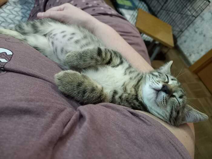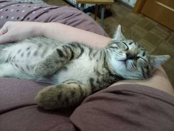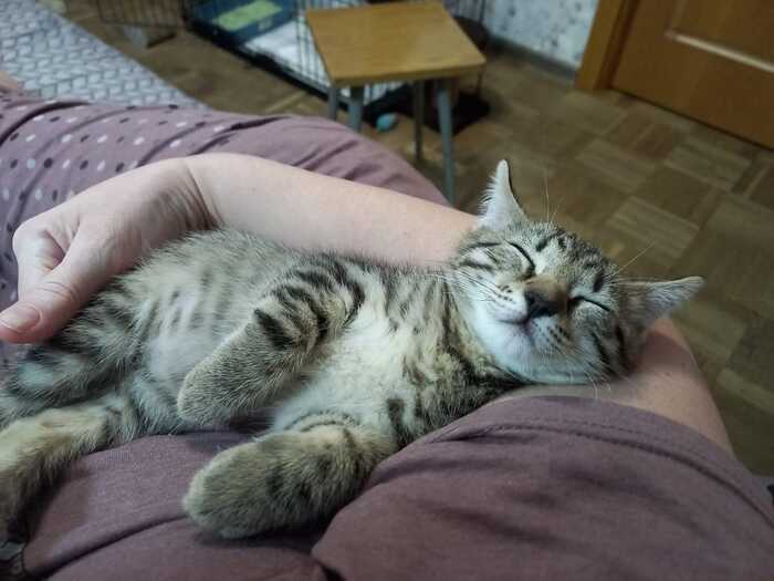 Перестала орать и лазать по антикошке, ходит строго в лоточек, сидит у меня на руках, мурчит и обнимает своими изящными лапками.