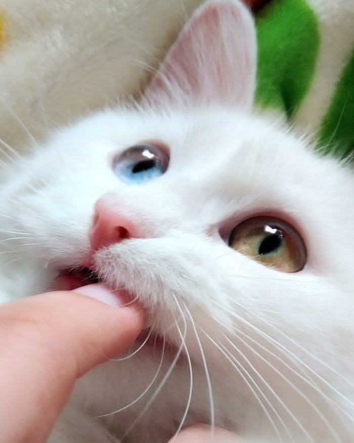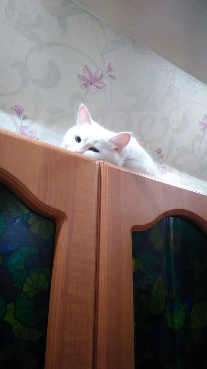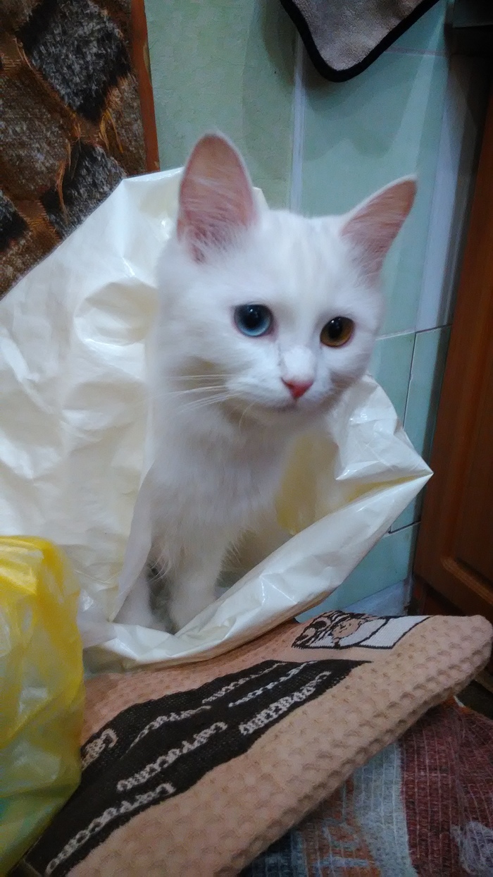 На улице в это время к ним прибилась местная банда котов. Все в скором времени разбежались, кроме этой наглой морды, которая на протяжении всего пути до дома путалась у ног. Сразу же отмыли её, напоили и накормили. На следующий день повезли в ветеринарку, дабы вылечить глазки.