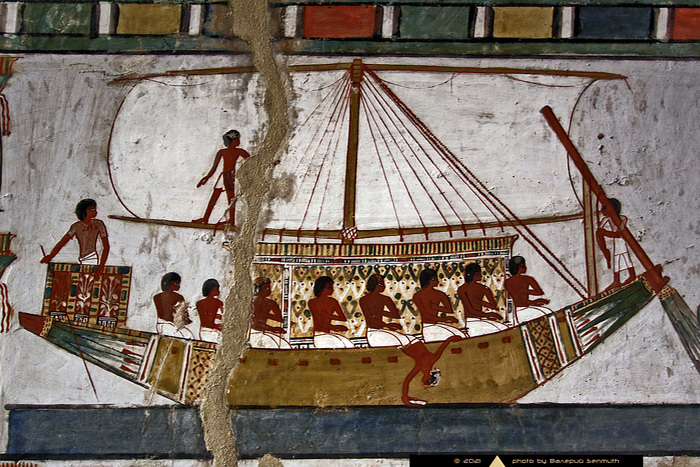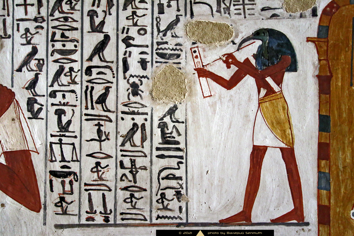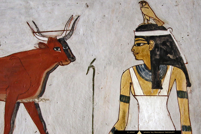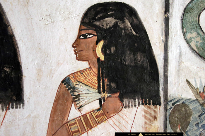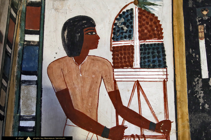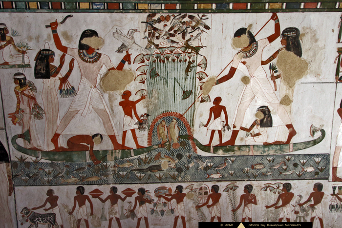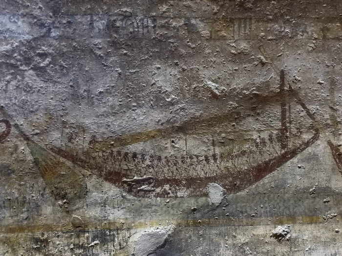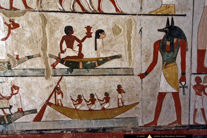 И вот входим в первую гробницу. После ослепительного дневного света не сразу различаешь изображения на стенах огромнейшего помещения. Это место упокоения чиновника и казначея Бакета III служившего в период 11 династии. Известно, что во время гражданской войны он встал на сторону фиванцев во главе с Ментухотепом II.