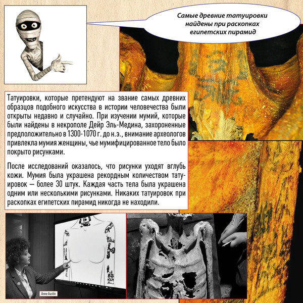 В одной из гробниц Дейр-эль-Медины обнаружили уникальную мумию женщины, чья шея, плечи и спина были покрыты множеством татуировок с религиозным смыслом. Татуировки, которые претендуют на звание самых древних образцов подобного искусства в истории человечества, ученые открыли относительно случайно. Они изучали мумии, найденные французскими археологами в 19-м веке. Изучая останки женщины, от которой осталось только туловище, случайно заметили необычные полосы на ее шее, которые изначально приняли за рисунок, нанесенный на тело уже после мумификации. Как показало подобное сканирование, кожа женщины была украшена рекордным количеством татуировок (более 30 штук), и каждая часть ее тела была украшена одним или несколькими рисунками. С какой бы стороны вы ни смотрели на эту женщину, вы всегда бы видели две пары глаз богов, взирающих на вас. Нанесение этих татуировок должно было занять уйму времени, и часть из этих процедур была весьма болезненной. То, что женщина подвергла себя таким мучениям, говорит о том, что она и окружавшие ее люди верили в божественную силу этих татуировок.