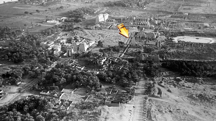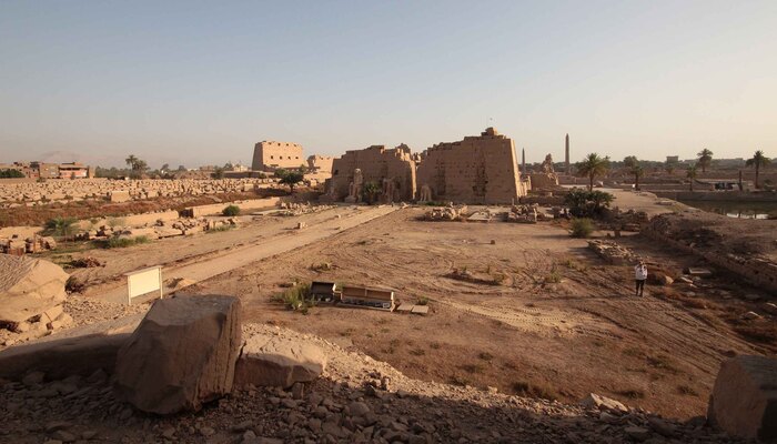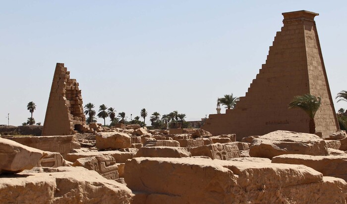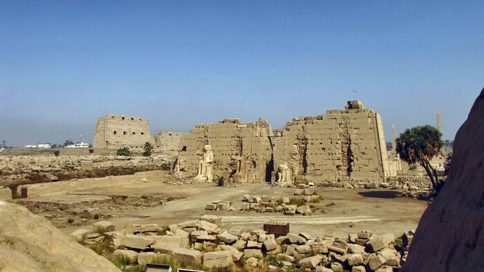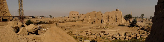 Слева виден пилон Нектанеба (Позднее царство, Основатель XXX династии), самый высокий из всех. Справа виднеются обелиски Тутмоса I и его дочери, царицы Хатшепсут (Новое царство, XVIII династия)