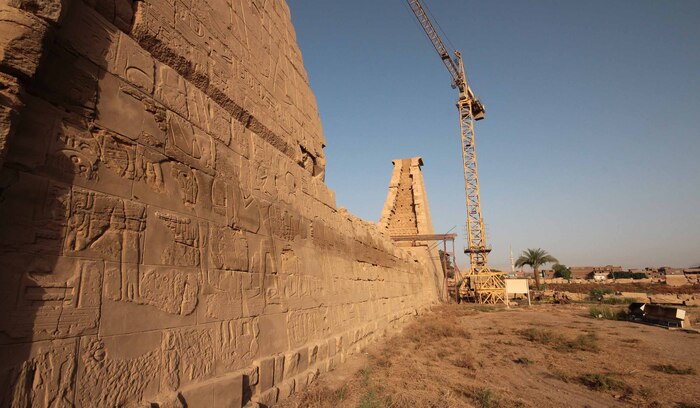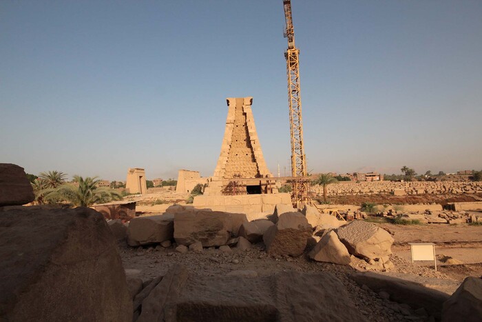 Разрушенный и всё ещё разрушающийся пилон необходимо было укрепить после того, как из него вытащили талататы, эхнатоновские блоки. Поэтому здесь долгое время возвышался кран.
