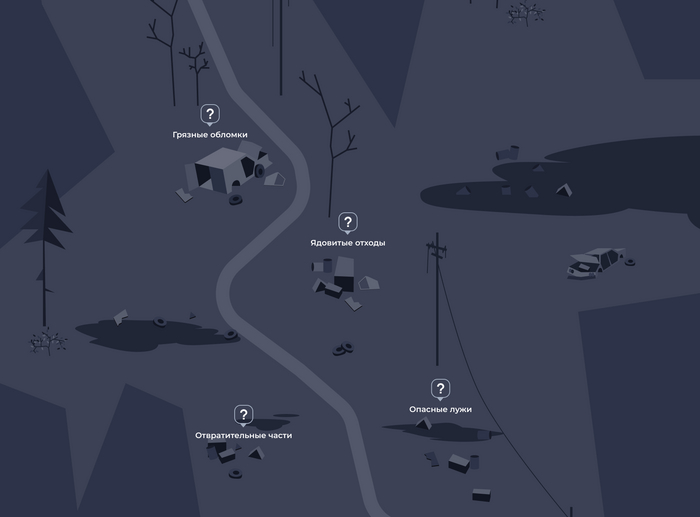 Ну тут картинки карт, давайте про карты. Мы обновили все карты, и теперь они выглядят не так убого, как раньше. Всякие там разрушенные пригороды, леса, шахты — всё это стало более чётким и интересным. Плюс, мы набросали кучу уникальных локаций, где можно найти всякие полезные штуки и наткнуться на местных жителей, или, что чаще, на тех, кто этими жителями только прикидывается. Половину нарисовали, другую половину в нейронках нагенерили. Ну а чё, век такой настал... не судите. Как выяснилось нагенерить нужную картинку в нужном стиле, тот ещё квест...