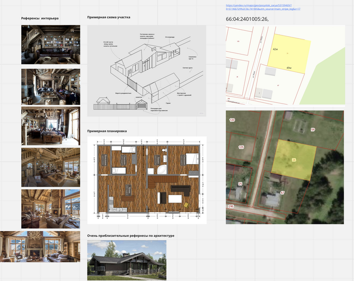 С этими данными на руках я начал думать, как я хочу чтоб это было. Я собрал все свои хотелки в одном пространстве. Подобрал референсы и нарисовал сам себе план участка, как отправную точку для передачи в проектирование.