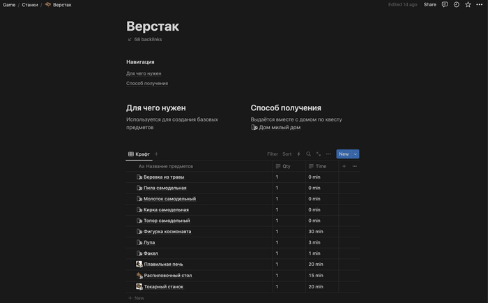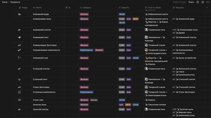 Так как в игре есть крафт и он эпический. Я завёл ноушен и описал всё что можно, что из чего делается, к чему относится, где добывается и зачем нужен. Выглядит это, как таблица на 400 строк.