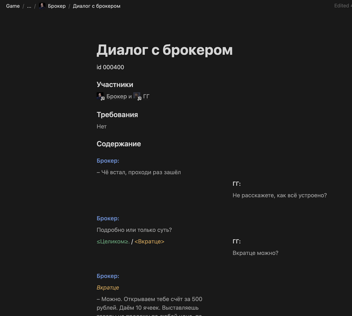 Ладно, если без шуток, когда я допишу все диалоги, я найму корректора и редактора. Смысл диалогов сейчас не в их содержании, а в наличии. Они должны отработать ситуацию, взять ГГ и дать ему вектор. Что именно будет в самом диалоге, на данном этапе значения не имеет. Главное, что ГГ выйдет с предметом, квестом, новой открытой локацией или механикой из диалога.