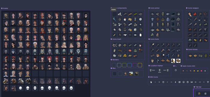 Все компоненты которые предметов и иконок, так же собраны на вариантах, чтоб их можно было подставлять в нужной ситуации в нужном экране.