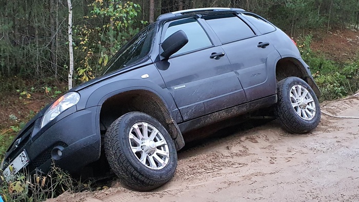 Как итог колейности, скользкой и мокрой дороги + шоссейной резины, на подъеме поймал "бровку" и проскользил боком на самую обочину, где и сел на мост. Благо, не перевернулся, хотя уже было на грани.