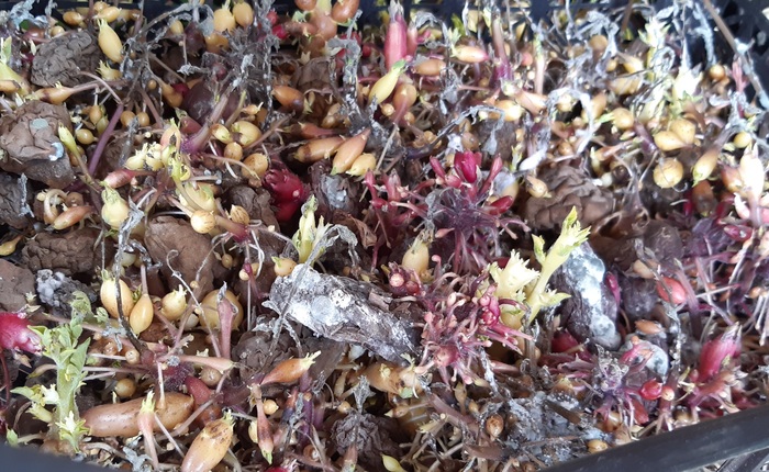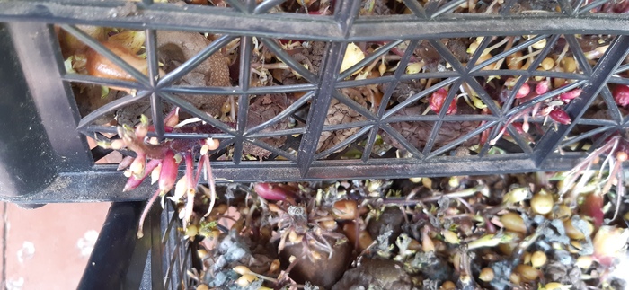 В 20 году урожай картохи убрали в подвал. К 21 году осталась пара паллет, подняли из подвала на веранду для проращивания, чтобы потом посадить, но все было не до того. Проросшую, уже в зеленых ростках картоху убрали в середине лета обратно в подвал.