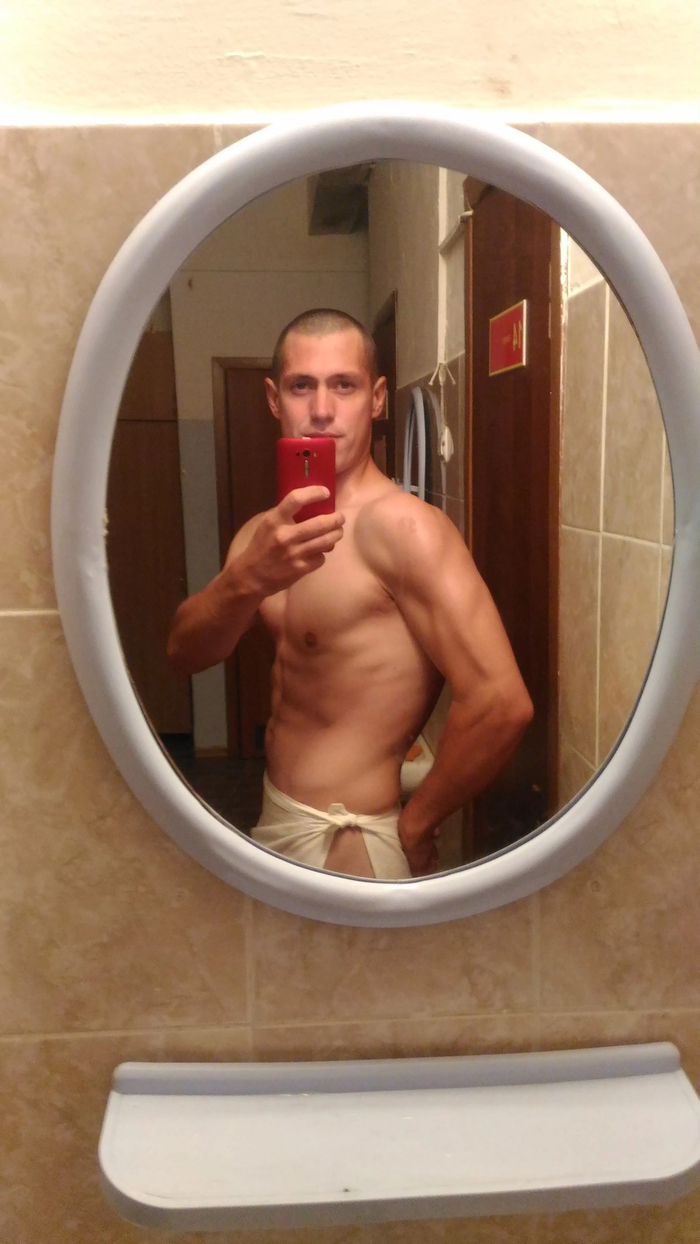 Это примерно полгода спустя. Вес 86 кг. Питание армейское, трехразовое. Режим, собственно, тоже армейский. Нагрузки, кстати, главным образом на ноги шли. Набедренная повязка, потому что фоткал для девушки (сейчас растим нашего сына, поэтому аккуратней будте, когда шлëте кому-то свои фото😁).