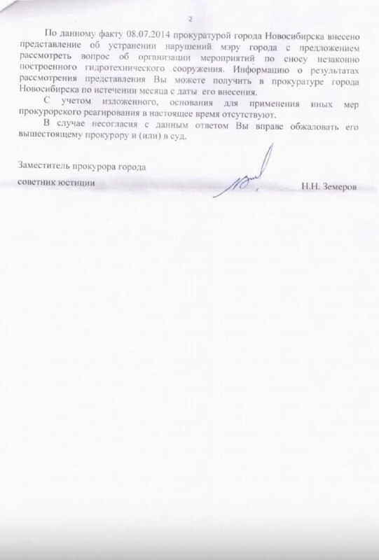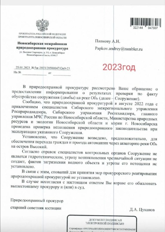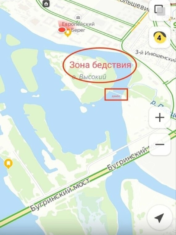 Незаконная гидротехническое сооружение (дамба) на территории Октябрьского района, города Новосибирска, была возведена более десяти лет назад. Кто возводил неизвестно или власти упорно делают вид, что не знают. В течении этих десяти лет дамба наносит огромный ущерб природе, перекрывая естественный ход воды ниже по течению реки. Русло реки изменилось за эти годы и вода пошла в обход дамбы, только по западной стороне острова Высокий. Дамба длиной 95 метров, соединяет два противоположных берега между островом Высокий и Октябрьским или Первомайским районом города Новосибирска. Остров Высокий, входит в систему островов в черте города Новосибирска, образованных слиянием двух малых рек Иня и Плющиха и реки Обь. Узнав, что было обращение к администрации президента РФ, местные власти заволновались, начали писать отписки о проведении проверок, а когда ситуация стала спокойнее, можно сказать пошли в наступление. Власти пытаются перевести дамбу из гидротехнического сооружения, в транспортную инфраструктуру и избежать ответственности. Ниже дамбы вода не проходит, а появляется она там только весной. К июню-июлю вода там пропадает, а оставшиеся лужи начинают цвести и превращаются в болото, в рассадник насекомых и мусора. Всё это потому, что островом пользуются неизвестные влиятельные люди, у которых есть связи в местных властных структурах. Поэтому столько лет, на эту острую проблему закрывались глаза, пока инициативная группа не начала борьбу с этим чиновничьим произволом из разных структур. С апреля прошлого года, шёл сбор информации об этом строении: фотографии, освещение о проблеме в СМИ, было обращение через социальные сети к жителям района, чтобы предоставили информацию те люди, которые обращались ранее по проблеме дамбы и ответы государственных органов на их обращения. Составив обращение в офис президента РФ, было собрано три тысячи голосов от неравнодушных граждан под обращением, с требованием снести дамбу и устранить последствия нанесённого ущерба окружающей среде. В ответ на обращение, местные чиновники из мэрии, из минприроды, из верхне-обского бассейнового водного управления, из природоохранной прокуратуры, забросали отписками, что всё под контролем, что идут исследования по проблеме дамбы с уточнением целесообразности дальнейшего сохранения этой незаконной плотины. После того как прошло некоторое время, вся бурная деятельность чиновников сошла на нет. Прокурор Новосибирской области, у которого были на приёме, отнёсся с пониманием к проблеме и довёл дело до суда. На данный момент, судебные разбирательства продолжаются. Представители органов государственной власти, за одно с представителями застройщика острова. Вместе пытаются доказать суду, что семьдесят лет назад этого острова не было, а значит и никакой дамбы нет, а это ни что иное как линейный объект транспортной инфраструктуры. На заседании судья обращается к прокурору как истцу, чтобы тот предоставил суду материал по незаконной постройке доказывающий, что это дамба. Говорит, что у суда нет даже фотографий объекта спора. Но, у представителя природоохранной прокуратуры видимо тоже ничего нет. К сожалению, инициативная группа, не является участником судебного процесса и помочь информацией судье не может. Дамба наносит непоправимый урон природе на данном участ