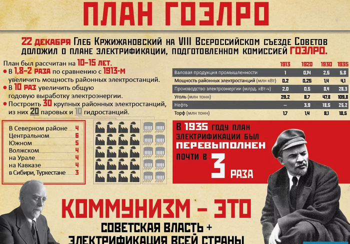 Отмечу, что план ГОЭЛРО предусматривал не только развитие энергетики, но в всей экономики страны. В частности, началось строительство Сталинградского тракторного завода. Началось развитие Кузнецкого угольного бассейна.