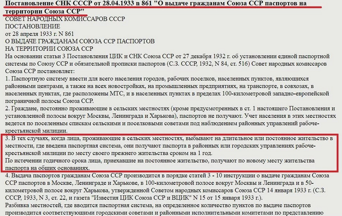 Источник инфо для статьи: Постановление Совета народных комиссаров. О выдаче гражданам Союза ССР паспортов на территории Союза ССР. 28 апреля 1933 г.