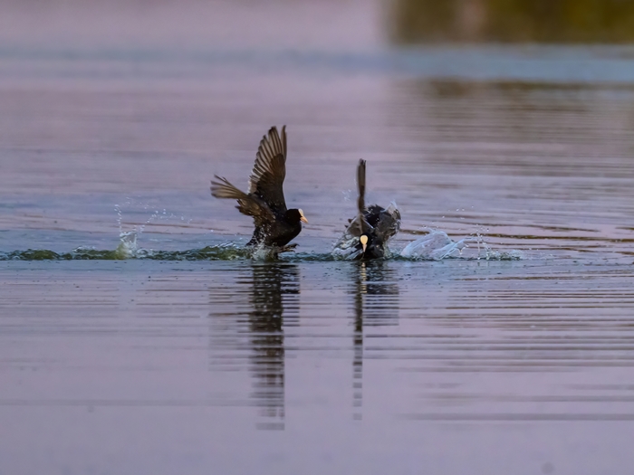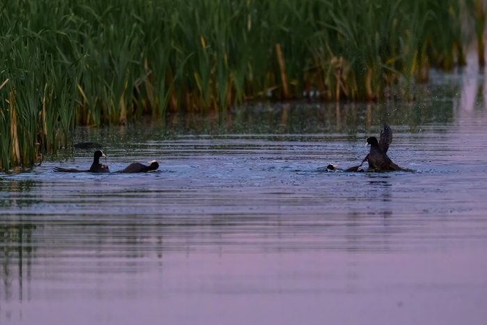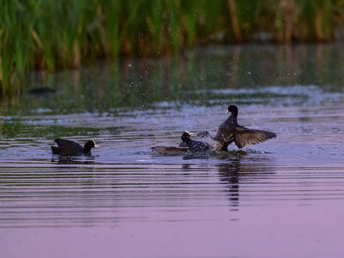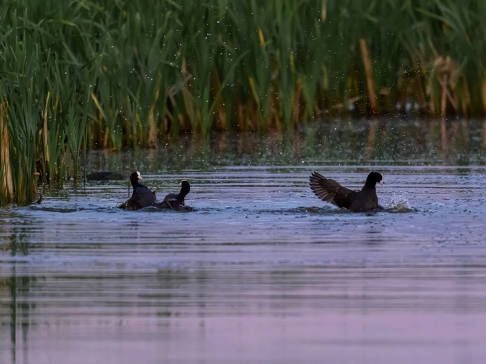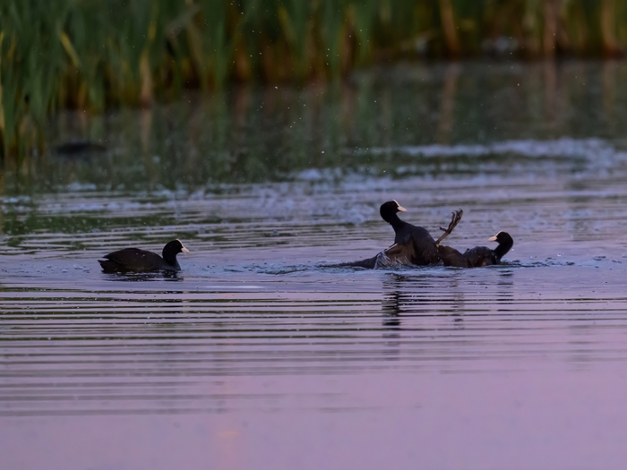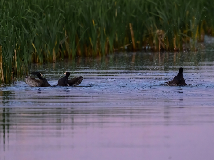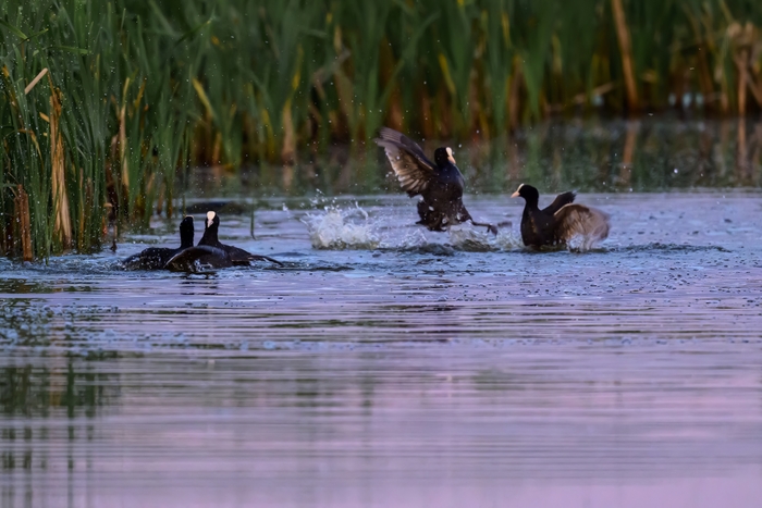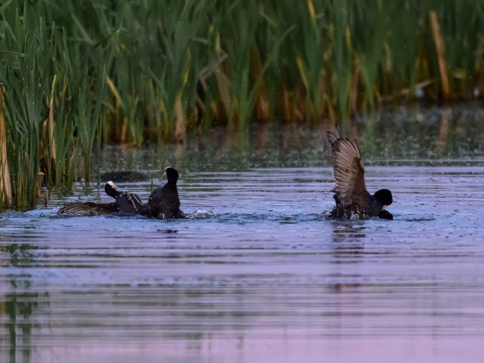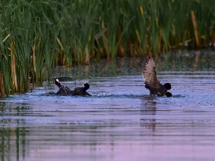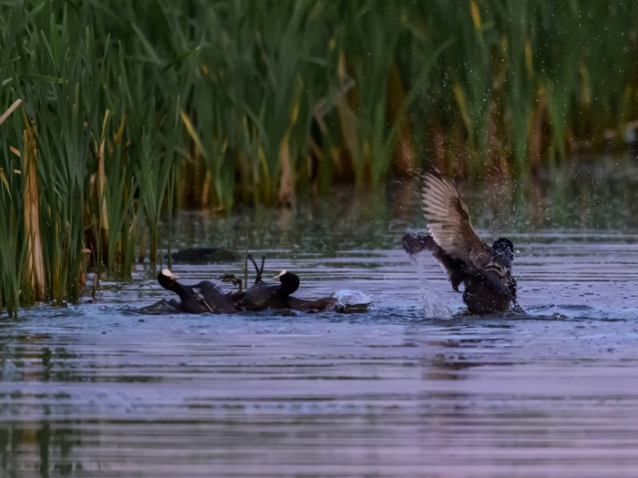 Утро в нашем болоте началось с драки двух пар лысух. Не поделили территорию, а именно, отмель с зарослями рогоза, где удобно кормиться.