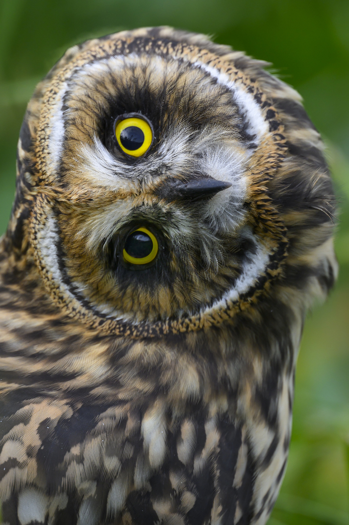 В этот необычайно богатый на мышей год я наблюдал за выводком из трёх совят болотной совы. Один из них выделялся своей смелостью. С широко распахнутыми, любопытными глазами он изучал окружающий мир, забавно вращая и наклоняя голову. Эта фотография запечатлела момент искреннего удивления и очарования юного исследователя, который смело открывает для себя тайны природы.
