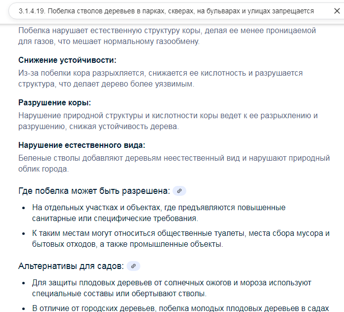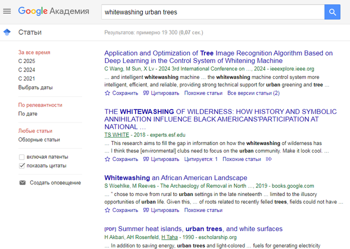 В научных журналах и на русском языке и на всех остальных языках мира нет ни одного исследования, которое подтверждало бы эффективность побелки деревьев в городе. Только те "специалисты", кто связаны с производителями средств для побелки, в попсовых интервью (не в научных статьях с доказательствами) говорят, что это полезно делать в городах. Их перепечатывают и цитируют, не зная, где первоисточник и подтверждения эффективности совсем - https://scholar.google.ru/scholar?hl=ru&as_sdt=0%2C5&...