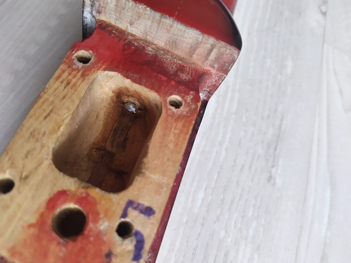От прежнего хозяина тушка досталась пол сильнейшим слоем грязи, сильными царапинами, лады с сильным из носом, благо техническое состояние системы тремоло, а так же бриджа было в хорошем состоянии, чего не скажешь о косметическом, хром лохмотьями повсеместно свисал с всех металических частей. Перекрас деки и грифа в условиях карантина мероприятие дорогостоящие и провальное, это же касается и гальваники для металических частей, пошел по пути упрощения и металлические части не контактирующие с руками были покрашены в металик и покрыты акриловым лаком, дека так же была им покрыта, это помогло скрыть множественные дефекты лакокрасочного покрытия, но вместе с тем получил новую проблему, достаточно восприимчивый к внешнему воздействию лак.