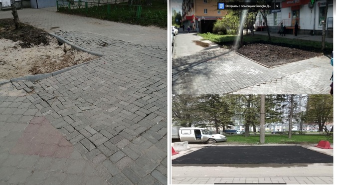 А через 1.5-2 недели мне ответили, сообщив, что брусчатку времени переложили, а с наступлением тёплой погоды делают ровный асфальт и привезут чернозём.
