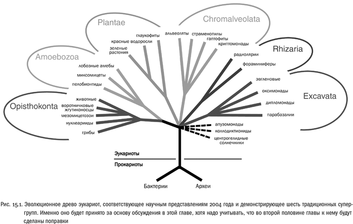 Третья часть, «Древо жизни», стала для меня самой богатой на открытия. Начинается все с истории становления систематики как науки. Мы видим, как разные учёные вносили в нее свой вклад, тем самым меняя сами основы этой науки, что в итоге привело к возникновению филогенетики. В современной биологии таксоны определяются не на основе сходства организмов, а по общности их происхождения. Мы привыкли, что эукариоты делятся на царства животных, растений и грибов, но данное деление давным-давно устарело, т.к. есть множество организмов, которых невозможно отнести ни к одной из вышеперечисленных групп. За основу современной систематики Сергей Ястребов берет эволюционное древо Аластера Симпсона и Эндрю Роджера, опубликованное в 2004 году. В нем выделяется шесть супергрупп (название «царства» сейчас практически не используется) и среди них вы не найдете ни одного знакомого названия. При этом автор подчеркивает, что за прошедшие годы в эту систему вносились изменения, ведь филогенетика – одна из самых быстроразвивающихся наук.