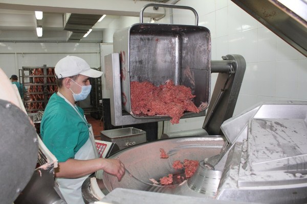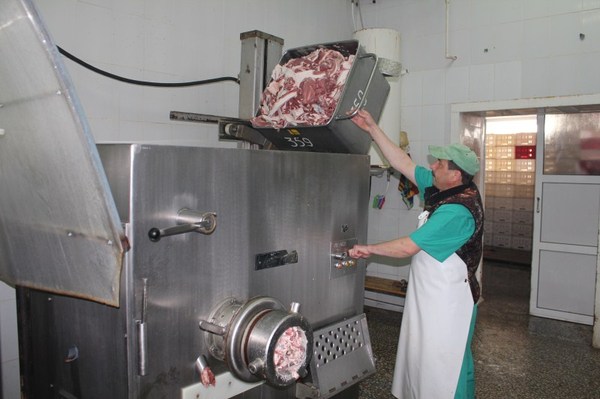 Следом очередь шкуродёрок, где с кусков снимается шкура. Далее мясо и обрезь поступает в большие мясорубки, где мясо измельчается для последующего использования в зависимости от вида изготавливаемой продукции.