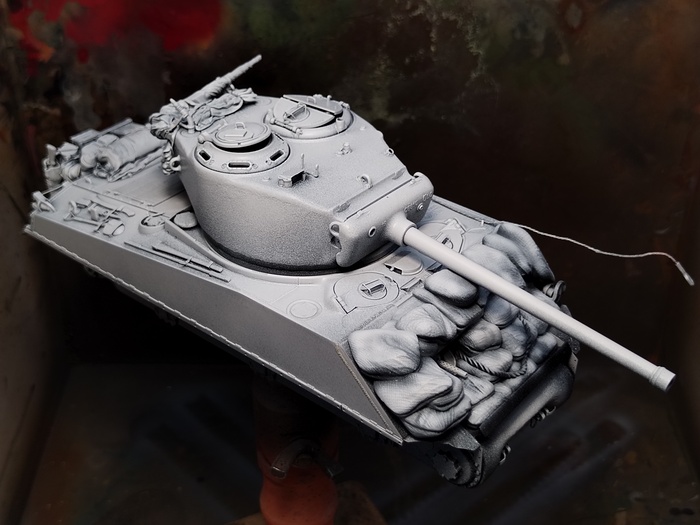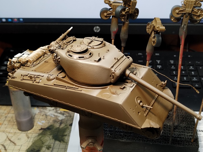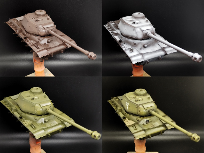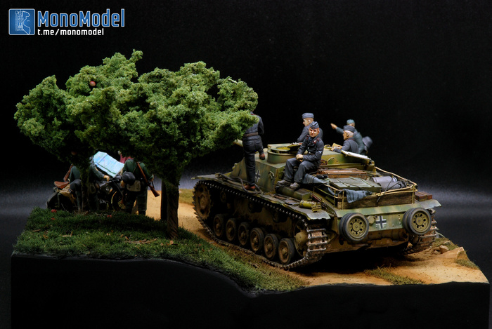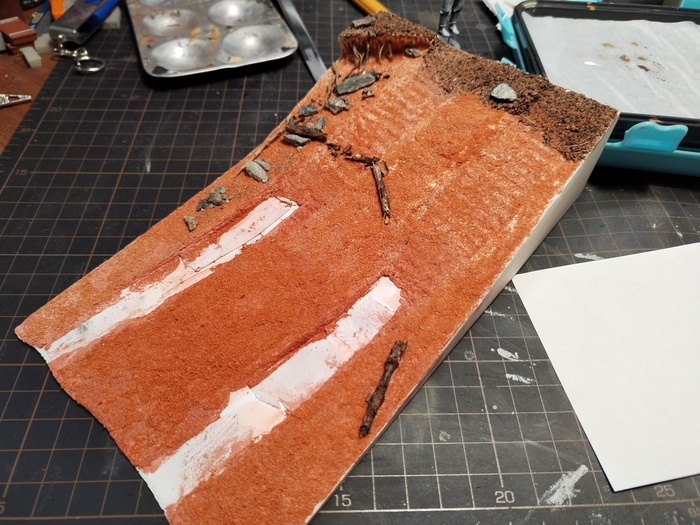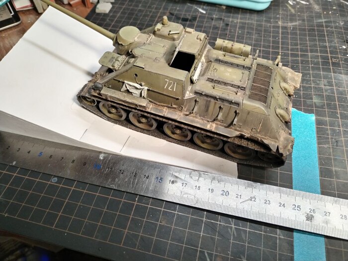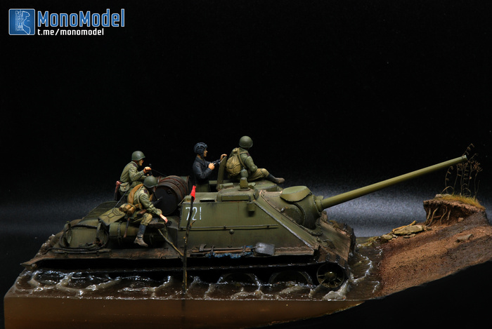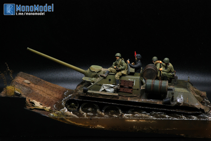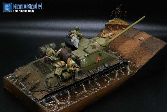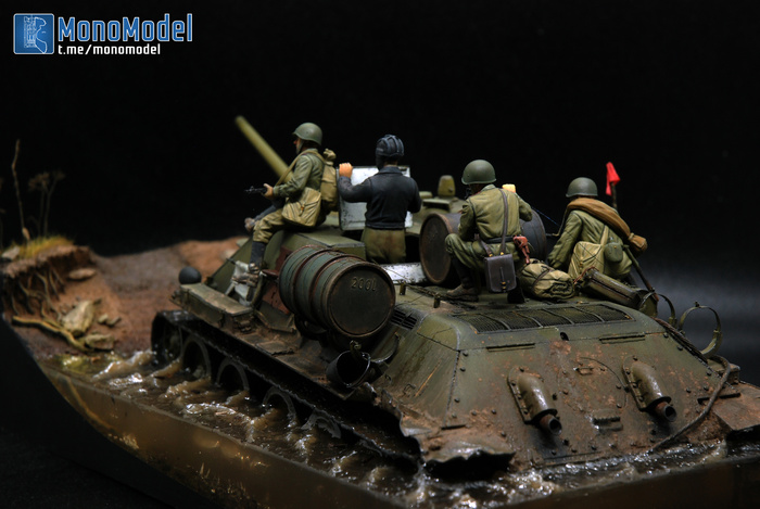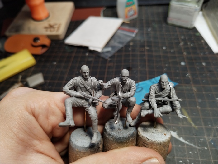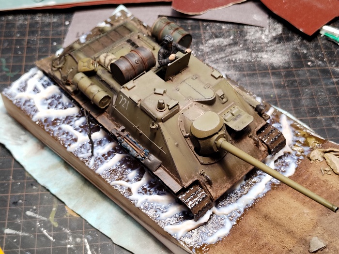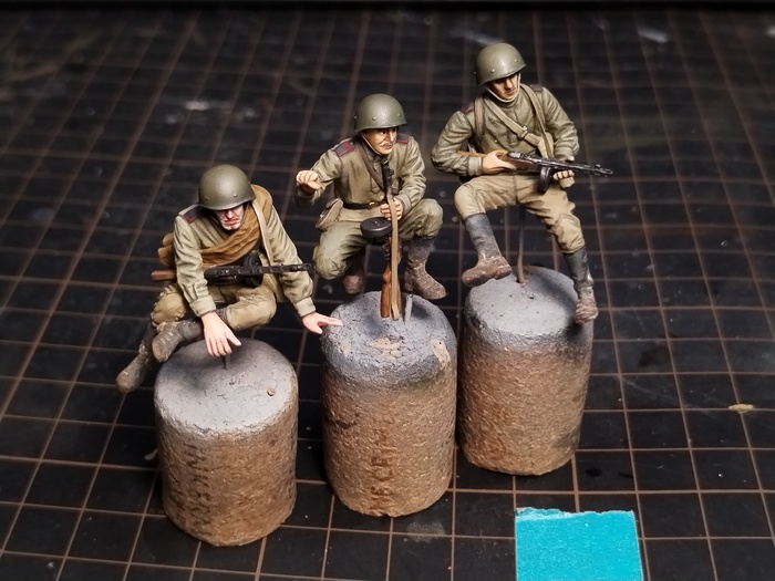 Из рекламного ПВХ слепил подставку 25х25см, были опасения, что ствол будет немного торчать, но они по диагонали все легко помещалось в габариты. Прикинул фигурки от Stalingrad из запасников, размещение в целом устроило, но правда нужно было бы развернуть все на этапе примерки, так как фигурка изначально сделана на правый борт, но я об этом не подумал.