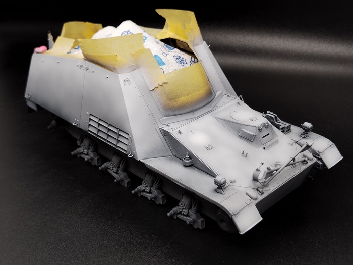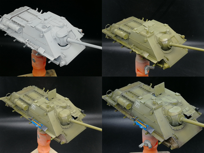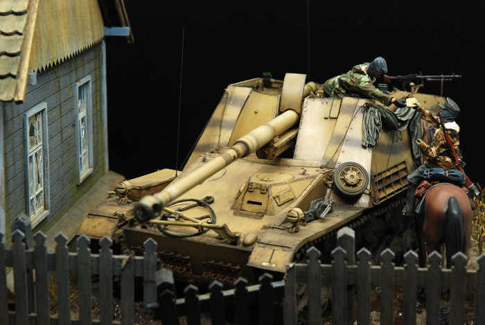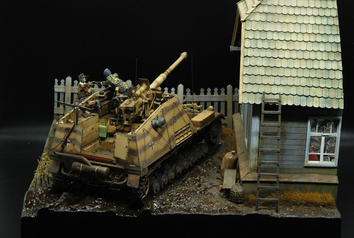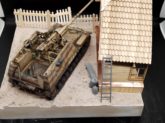 После окончания работ по сборке всего вместе, приступил к окраске. Красил акрилами, используя различные приемы. Потертости на доме имитировал с помощью жидкости для чипинга. Ржавчину на цоколе делал с помощью кусочка губки для мытья посуды. Рельеф базово покрасил из аэрографа.