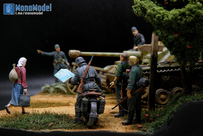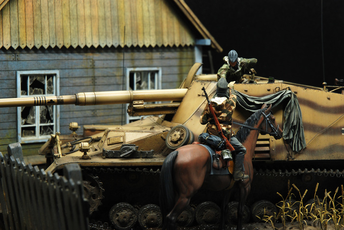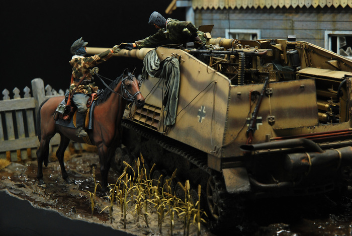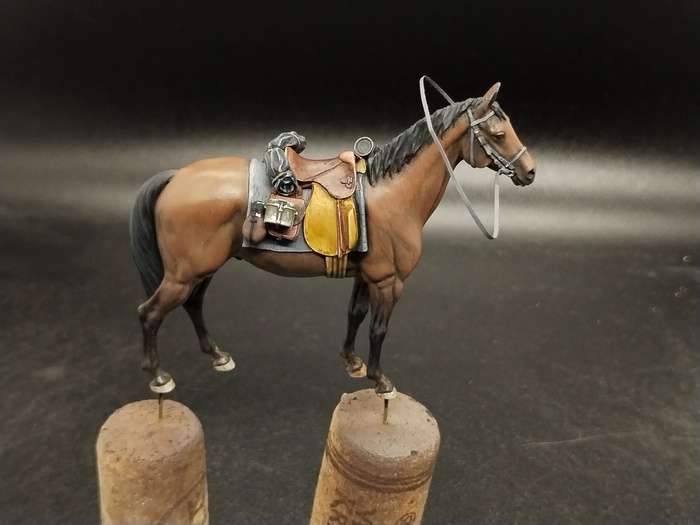 Пришла очередь фигур и это было совсем непросто с учетом того, что я понятия не имел, как покрасить коня... Немного усилий при сборке и шпатлевке смоляной модели, а дальше работа маслом и акрилом. Пришлось глянуть пару гайдов, а также посмотреть, как вообще выглядит то лошадь в жизни. Не все оказалось так просто. Попробовал мазками показать шерсть, вроде на окончательном результате это немного заметно.