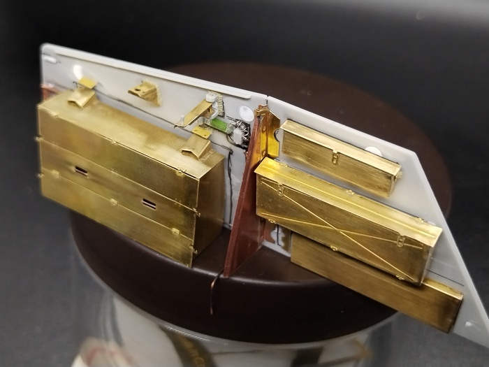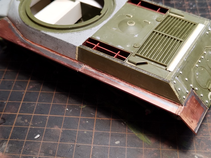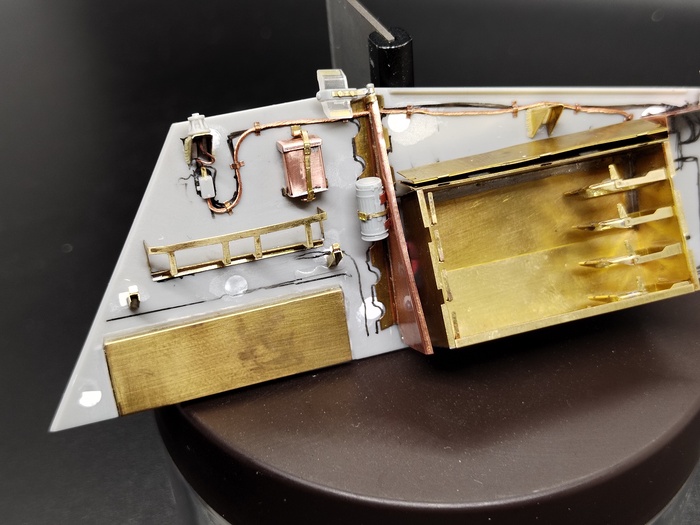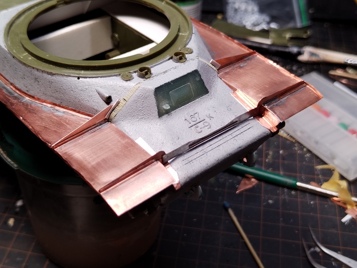 После примерки приступил к доработке домика. Был сделан цоколь, без него домик выглядел сиротливо. Сам цоколь собран из шпона и бальсовых брусков. Сверху сделано покрытие из листовой меди. Выглядит уже более основательно в отличии от изначального варианта. Так же доработал окна приклеив маленький кусочек подоконника и вклеив разбитые стекла из защитного стекла для смартфона.