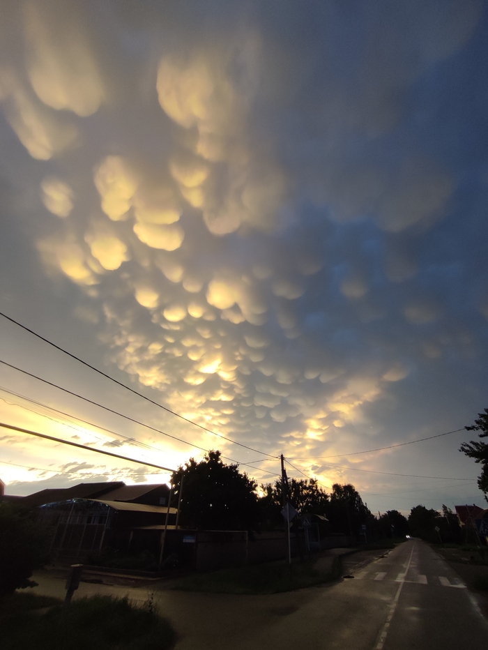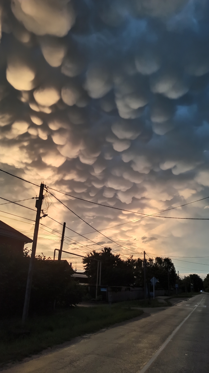 Мамматусы, они же вымеобразные облака. Гугл говорит, что эта редкая разновидность кучево-дождевых облаков образуется чаще всего в тропических широтах. Первый раз увидела вживую.