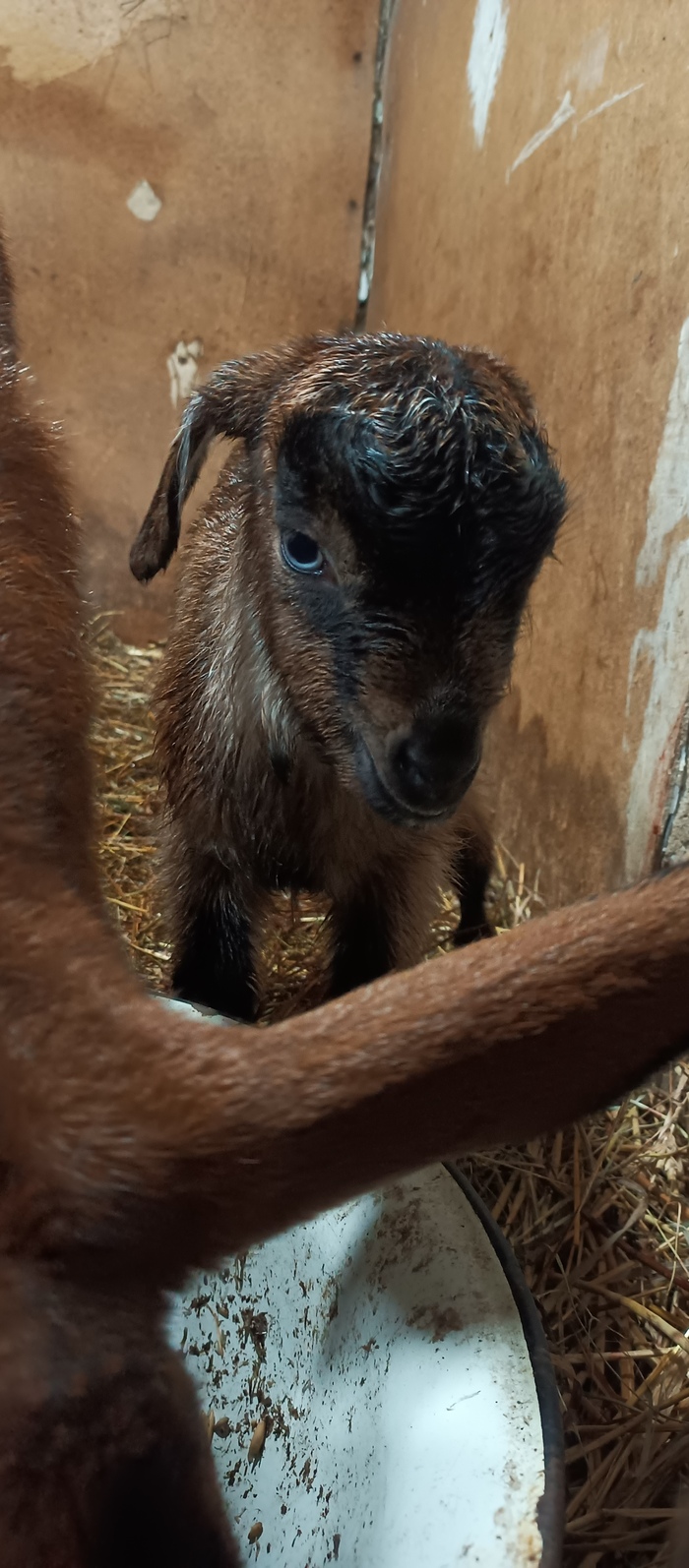 Утром управилась, все спокойны, стоят едят, в обед сходила воды донесла тем кто выпил, ну и пошла себе готовить, день рождения всё таки, гостей жду, два часа не была в сарае, зашла а тут нате вам подарочек). Козлёнок почти сухой, и уже сытый, мать ест. И ведь явных признаков то не было. Не, вымя то выросло, не прям сразу, а как-то постепенно, и наливаться стало сильней уже после окота.