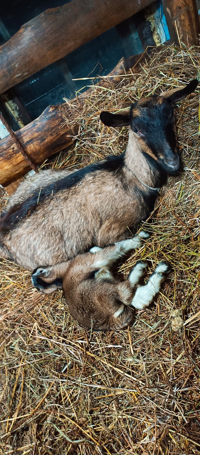 Я прям сильно удивилась и расстроилась, ну как так, вроде такая крепкая и сдохла. Обычно козленок лежит в таком положении либо когда уже отъехал либо незадолго перед тем. Подошла и удивилась второй раз - спит она так. Дыхание ровное, всё нормально, просто ей так удобно.... За почти 7 лет содержания коз не видела чтобы здоровые козлята так спали. Растормошила на всякий случай)