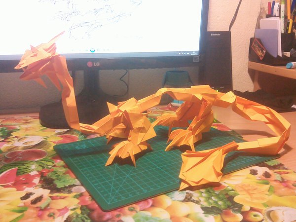 Дракон на фото выше из нескольких листов бумаги (модульный). Ну и да, он очень кривой получился.