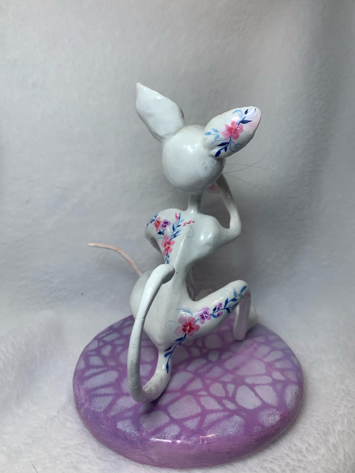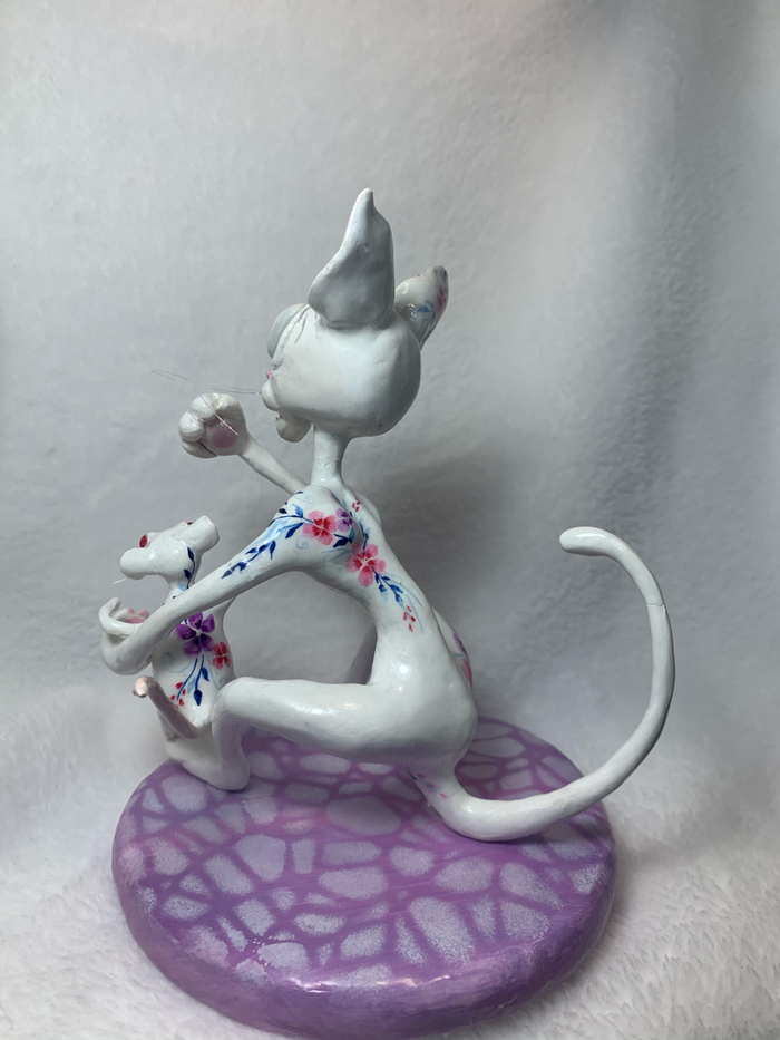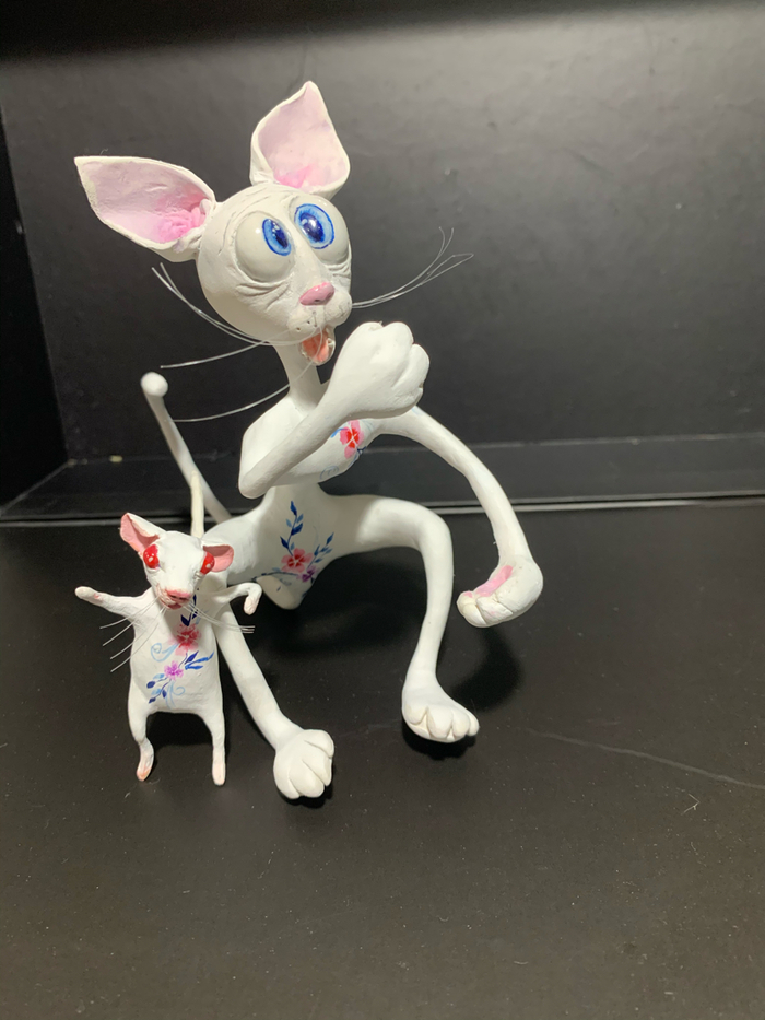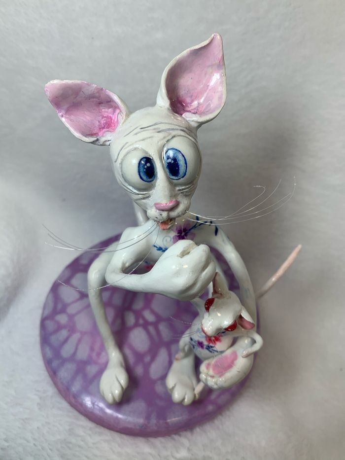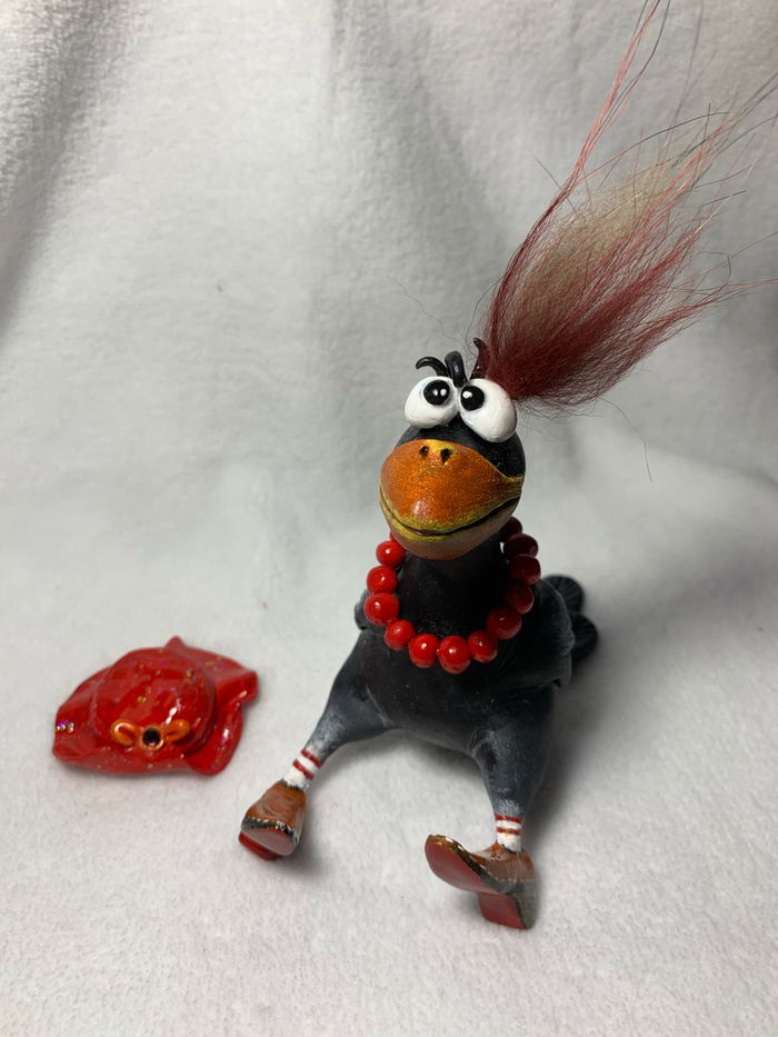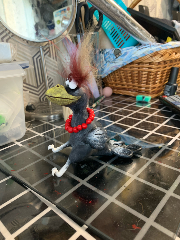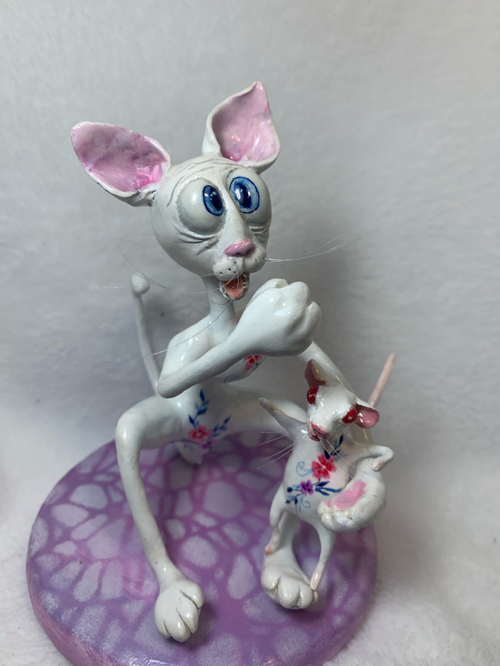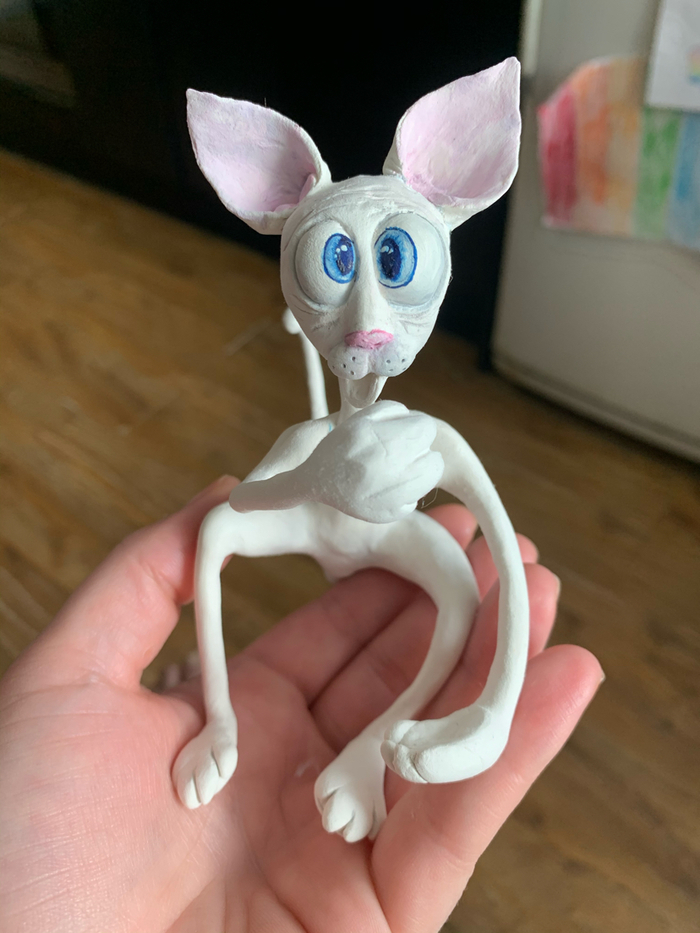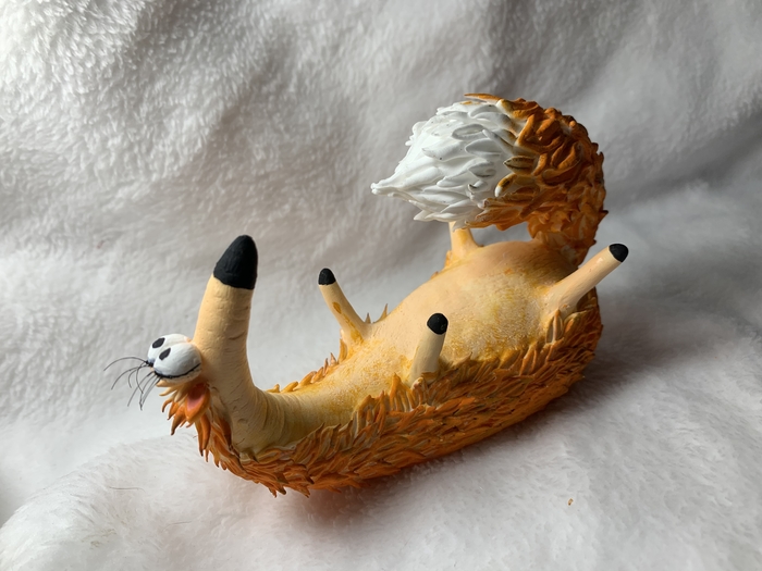 Слепила загогулину), прилепила глаза, облепила чем то вроде меха, и покрасила акриловыми красками) Все из бархатной глины, перерывы были только на просушку.
