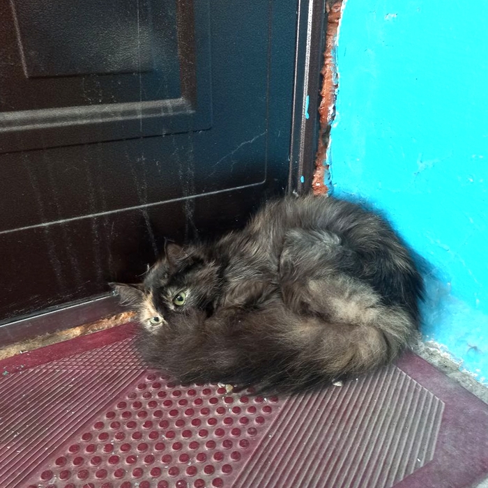 Кошкам негде жить — они явно никогда не были на улице, сидят в подъезде под своей дверью, очень напуганы. Квартира, видимо, нужна кому-то, а животных просто выбросили...