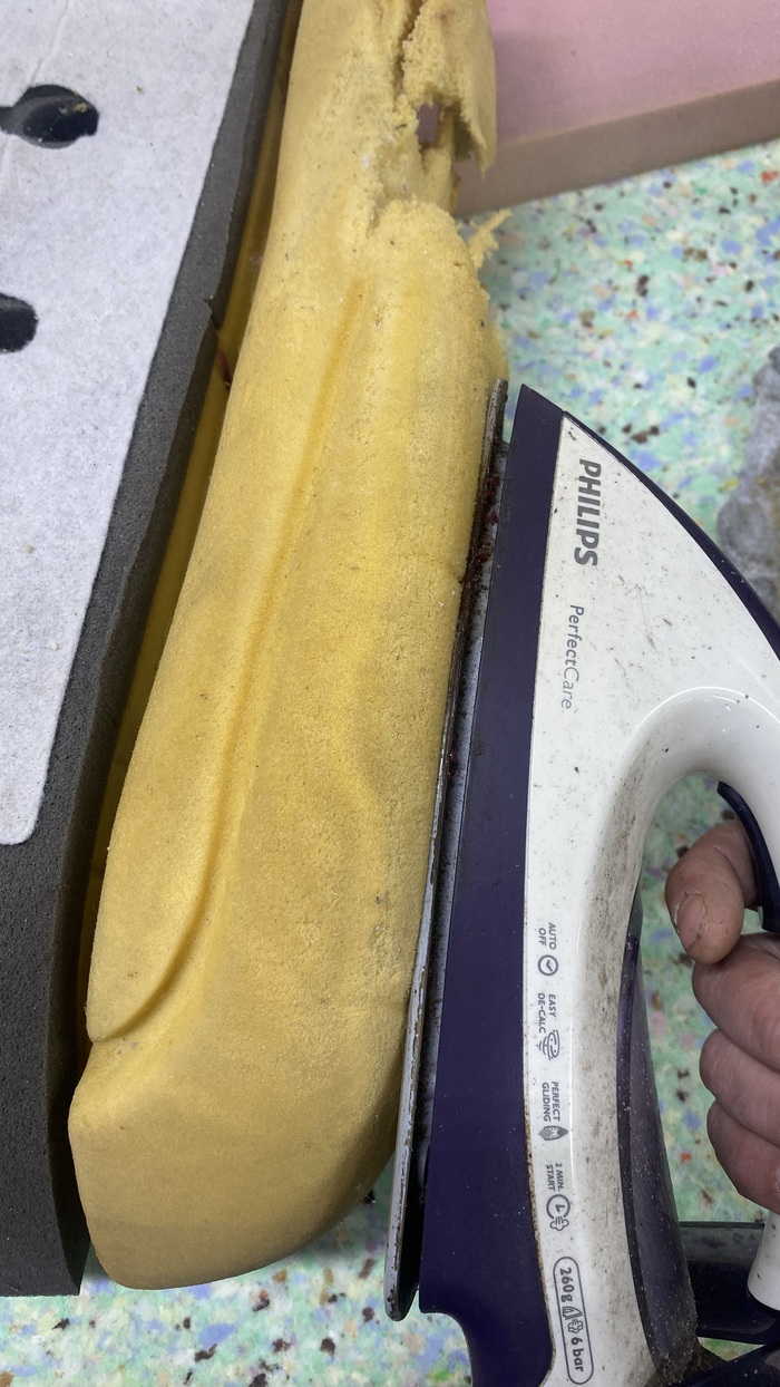Ну да ладно, приступаю. Сначала нужно вернуть поролону максимально возможную родную форму. Для этого просто отпариваю большим количеством пара. Реально работает.