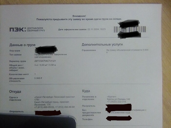 Так вот цена меня устроила 848 рублей за доставку, отправление с отделения ПЭКа СПБ Ленинский проспект 176 дата оформления 02.11.2024.