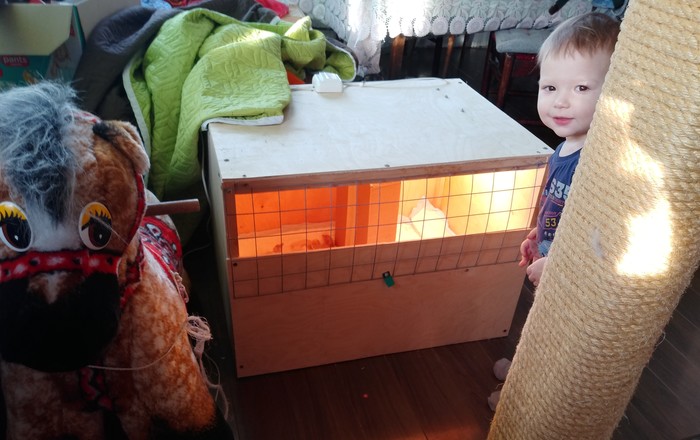 А это чудо инженерной мысли моего супруга - брудер. В нём есть всё самое нужное: свет и тепло. Дно простелила газетой и одноразовыми пеленками.