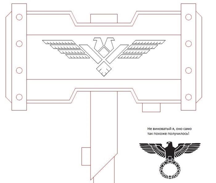 Привет Пикабу! Пишу сей первопост не собрания плюсов (или минусов) ради, а для получения конструктивной критики и толковых советов. Приступим к основе истории. На протяжении уже лет трех являюсь если и не фанатом вселенной «Боевого Молота» то, по крайней мере, сочувствующим (пара сборников Комиссара Каина на книжной полке тому подтверждением). И с переменным успехом раз в полгода я возвращаюсь либо к книгам, либо к играм (жаль не настольным) по «Вахе». И вот в очередной раз обострение случилось перед новым годом, и уже месяц меня не отпускает: книги читаю, подкасты «Голоса Императора» переслушиваю, и в таком духе. Не отпускает на столько, что на днях пришла в голову мысль, а смогу ли я сделать раскроечный чертеж для громового молота, а потом воплотить его в металле или дереве? В качестве образца выбрал для себя крайний правый со следующего изображения. Остальные были либо сложные, либо просто не понравились по эстетическим соображениям.