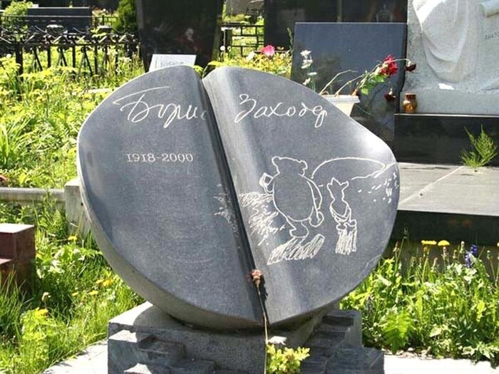 Это, конечно, была шутка, но вот на надгробном камне переводчика Бориса Заходера действительно выгравирован знаменитый рисунок Шепарда - Винни-Пух и Пятачок, уходящие вдаль.