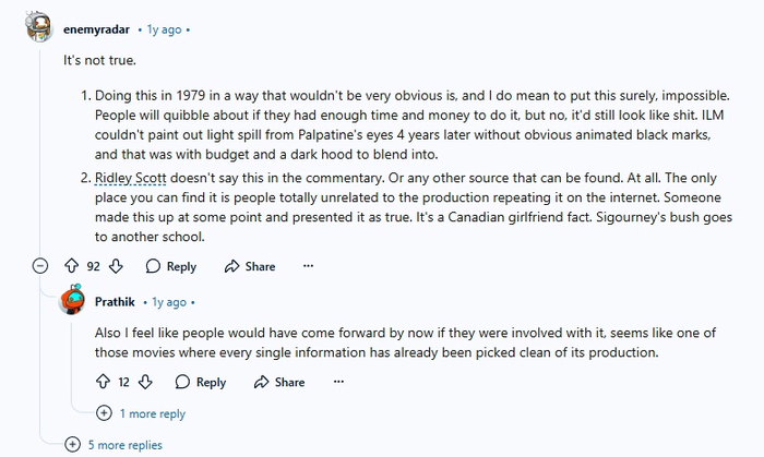 Но так как я пишу долго, то раскрою карты сейчас — этот факт выдуман и так давно разошёлся по сети, что многие в него верят. Ридли Скотт никогда не заявлял ничего подобного в реальности. Увы.